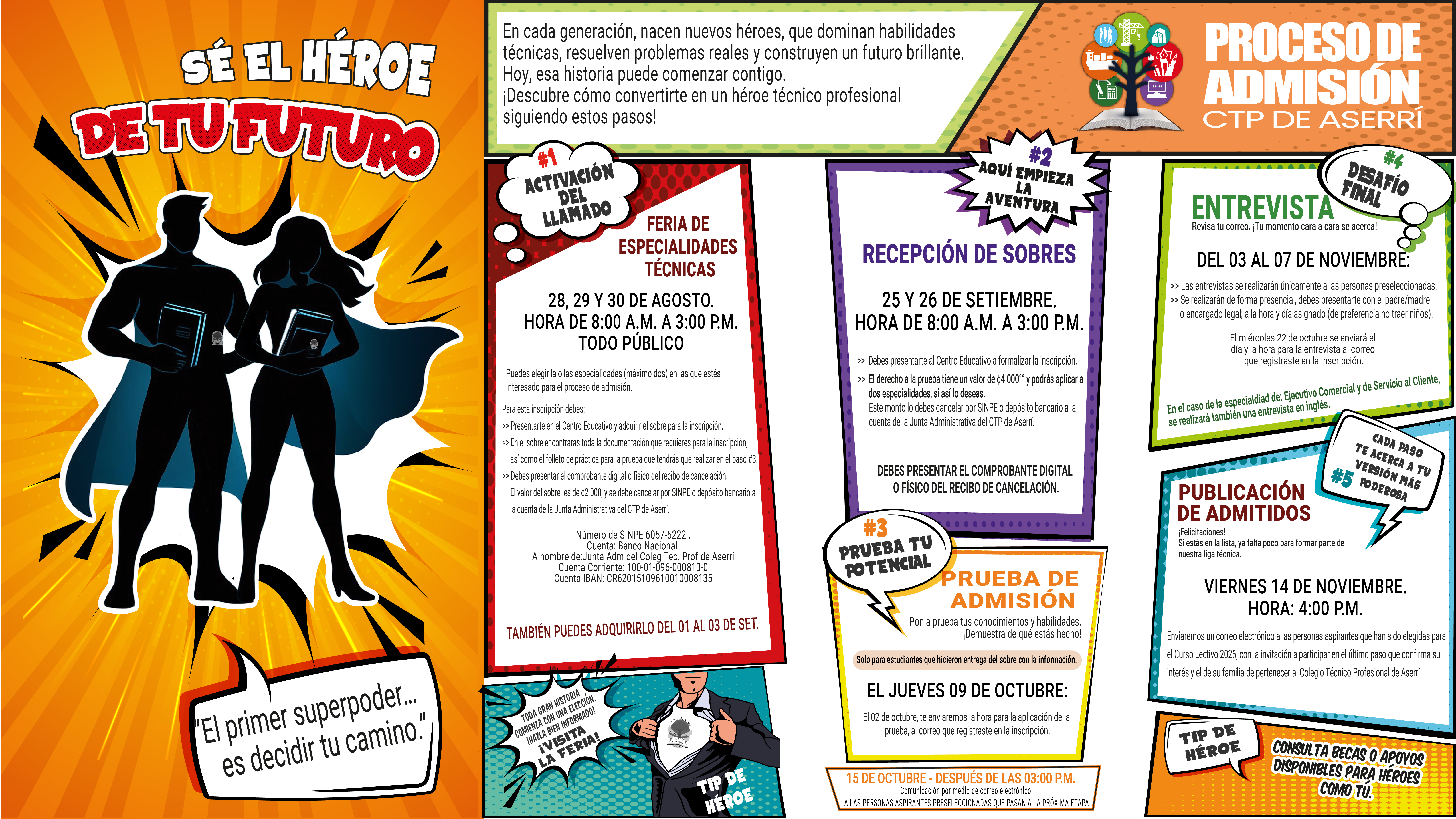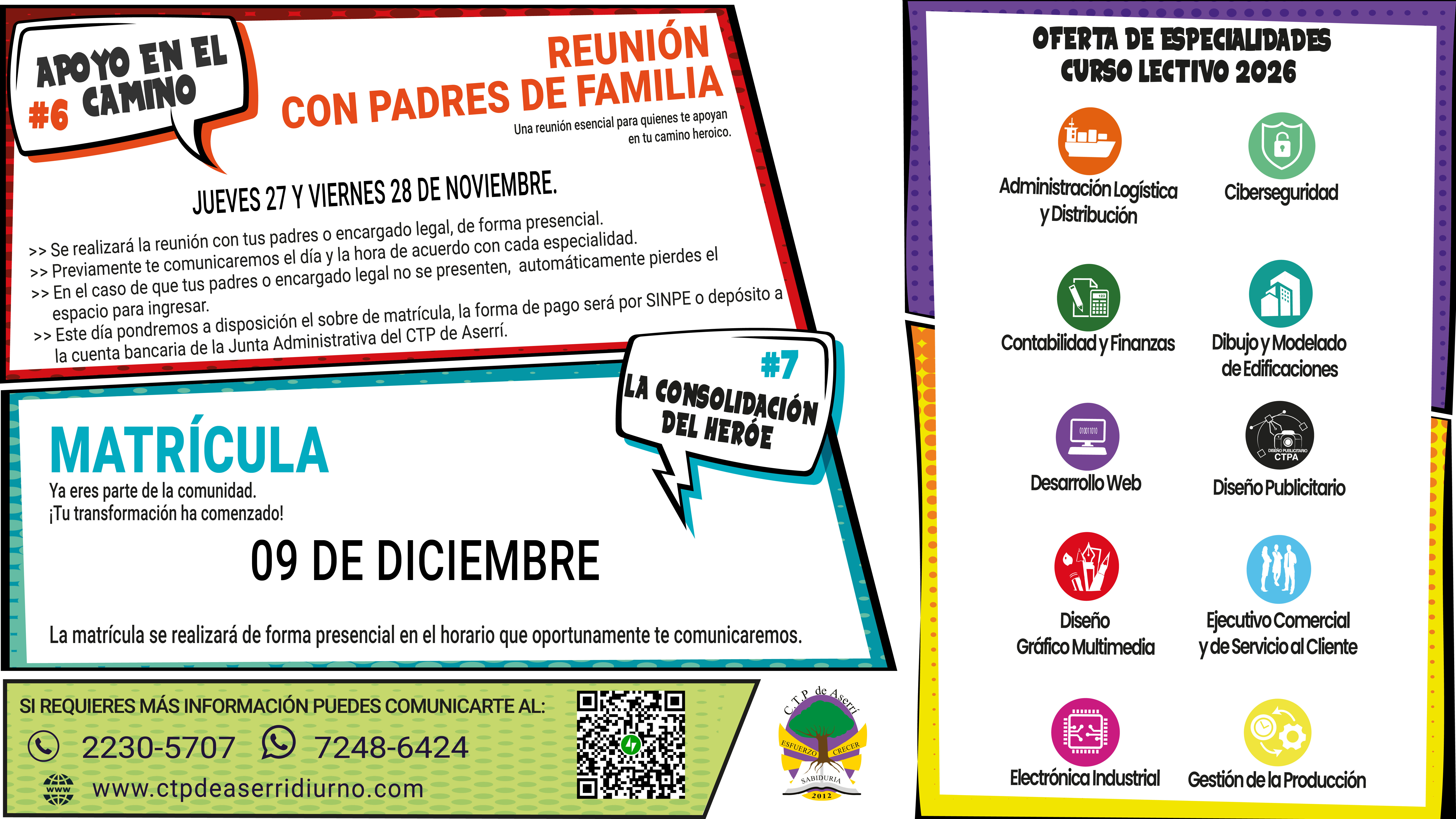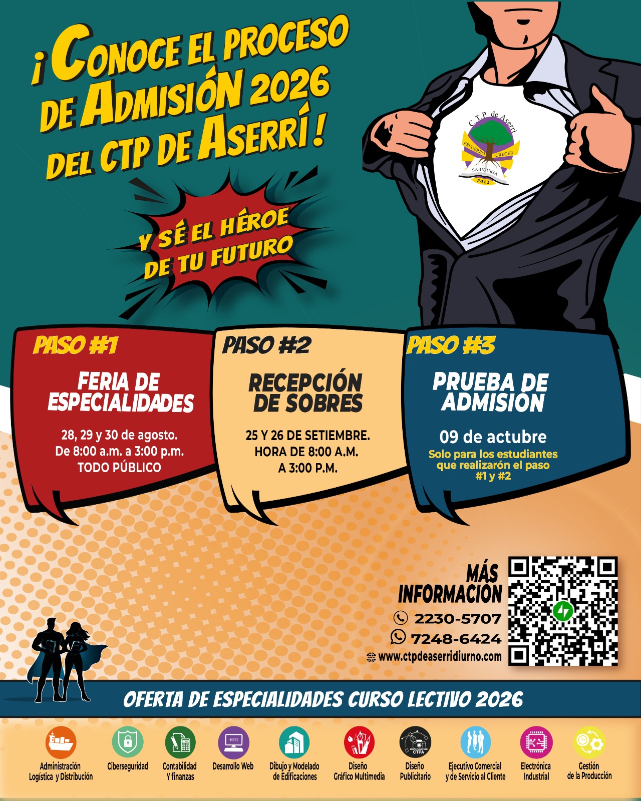 Admisión 2026 ESPECIALIDADES PARA EL 2026 Da click a cada uno de los iconos para conocer más de cada especialidad Administración Logística y Distribución Ciberseguridad Contabilidad y Finanzas Desarrollo Web Dibujo y Modelado de Edificaciones Diseño Gráfico Multimedia Diseño Publicitario Electrónica Industrial Ejecutivo Comercial y de Servicio al Cliente Gestión de la Producción FECHAS IMPORTANTES REGLAMENTO DE ADMISIÓN Y MATRICULA A LAS ESPECIALIDADES TÉCNICAS Reglamento_Admision_CTP_Aserri_2025Descarga